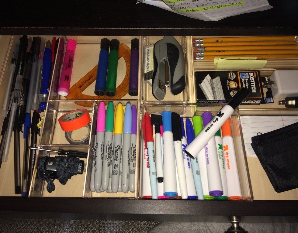 Pencils and pens, measuring tape, gum, scissors, thumbtacks, hammers, old thank-you cards, Christmas pictures from 98', Taco Bell hot sauce packets, napkins, 3-year-old candies, party balloons... you name it, you can find it.