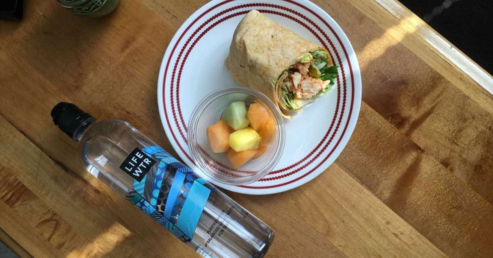 If you're still hungry, go grab some of the fruit off the salad bar. The fruit changes every day, but it's probably around 60 calories to fill up 1/3 of one of those red bowls. Selections typically include peaches, mandarin oranges, or pineapple.