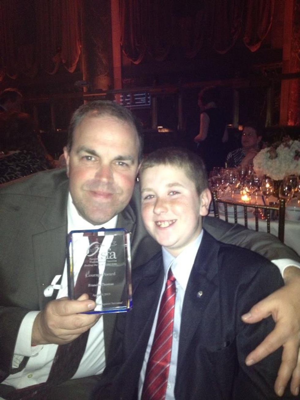 My dad holding his Courage Award sitting beside my little brother at the gala.