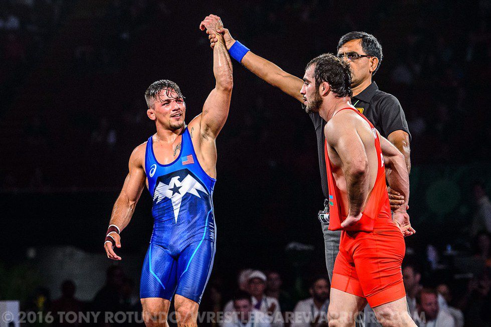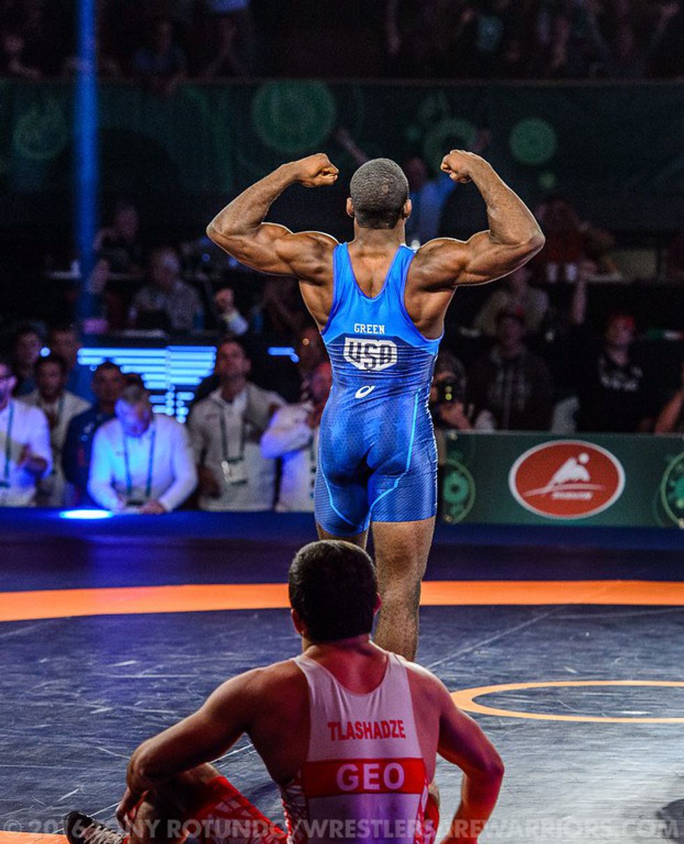 Despite the disappointing team finish, Team USA looked good heading into the Rio Games. At the non-Olympic weights of 61KG and 70KG, Tony Ramos (2x World teamer at 57KG) and 2015 World Bronze James Green, respectively, represented the US. Ramos went 2-2 on the day, topping 2015 World 5th (at 61KG) Bajrang of India 3-3 on criteria and 2013 Junior World Champion (at 60KG) Ahkmednabi Gvarzatilov of Azerbaijan 10-4. The bump in weight-class would prove to high, however, when Ramos went against 2x World Bronze Masoud Esmaeilpour Jouybari of Iran. Esmaeilpour (who has wrestled at 65KG in the past) was, quite frankly, able to out-muscle Ramos en route to an 8-2 victory. In the 3rd-place dual, Ramos dropped an intense 5-8 match to Beka Lomtadze of Georgia. Trailing 1-4 late, Ramos got to a huge 4pt throw that gave him a 5-4 lead.