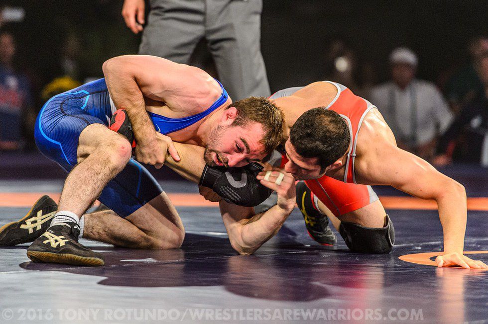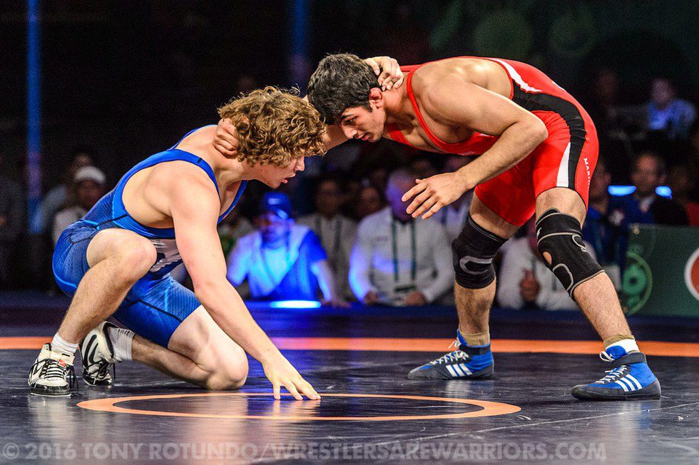 (Daniel Dennis, blue, looks to secure a single-leg takedown over Hassan Rahimi of Iran)“The Wild Man” Daniel Dennis (57KG), fresh off making his first ever World team, started with a forfeit win over India and a 10-0 tech fall over Makhmud Magomedov of Azerbaijan. His next two matches, however, would be a helluva test. Dennis would face both finalists from the 2015 World Championships at 57KG, starting first with returning World Silver Hassan Rahimi of Iran. After scoring the initial takedown on a beautiful single-leg finish, Dennis would be overwhelmed by Rahimi’s non-stop offense, losing 2-7. In his final match of the event, Dennis faced 2015 World Champion Vladimir Khinchegashvili of Georgia. Dennis again scored first, getting to his takedown and immediately turning the World Champ with two gut-wrenches to lead 6-0. Khinchegashvili, however, got into gear as he scored 8 unanswered points before pinning Dennis with 2:32 elapsed in the first period. We’ll see what adjustments Dennis can make before Rio.