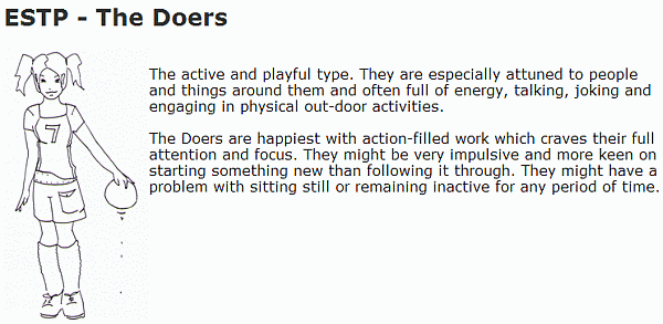 Interested in how and why things work; Do not function well in regimented, structured environments; they will either feel stifled or become intensely bored; Constantly gather facts about their environment and store them away; Have an excellent ability to apply logic and reason to their immense store of facts to solve problems or discover how things work; Learn best "hands-on"; Usually able to master theory and abstract thinking, but don't particularly like dealing with it unless they see a practical application; Action-oriented "doers"; Focused on living in the present, rather than the future; Love variety and new experiences; Highly practical and realistic; Excellent "trouble-shooters," able to quickly find solutions to a wide variety of practical problems; Results-oriented; they like to see immediate results for their efforts; Usually laid-back and easy-going with people; Risk-takers who thrive on action; Independent and determined -- usually dislike committing themselves; Usually quite self-confident.