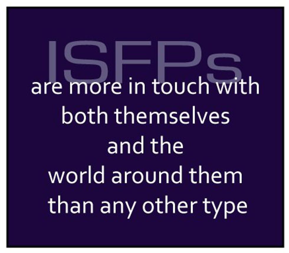 Keen awareness of their environment; Live in the present moment; Enjoy a slower pace -- they like to take time to savor the present moment; Dislike dealing with theory or abstract thought, unless they see a practical application; Faithful and loyal to people and ideas that are important to them; Individualistic, having no desire to lead or follow; Take things seriously, although they frequently appear not to; Special bond with children and animals; Quiet and reserved, except with people they know extremely well; Trusting, sensitive, and kind; Service-oriented and driven to help others; Extremely well-developed appreciation for aesthetic beauty; Likely to be original and unconventional; Learn best with hands-on training; Hate being confined to strict schedules and regimens; Need space and freedom to do things their own way; Dislike mundane, routine tasks, but will perform them if necessary