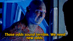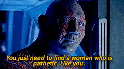 Drax started out as a humorless, overly literal bucket of manpain. In the first film, he hated the character Gamora, because of her association with Ronan, the being who murdered his family, and his primary objective was avenging his family. He was cliche, but his story wasn't a terrible one.