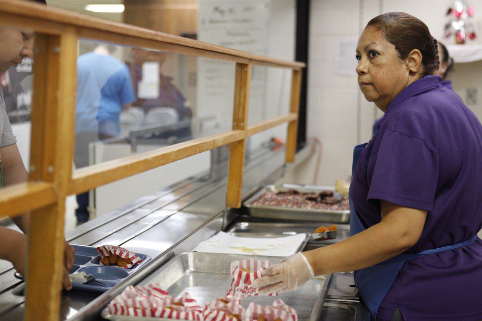 A cafeteria worker serving food to college students. Does someone notice her, or do they just think, "this is her job." Why should we thank her? Someone does notice her and speaks Spanglish to her. That person found out she wants her grandkids to learn Spanish, but you gotta start them young.