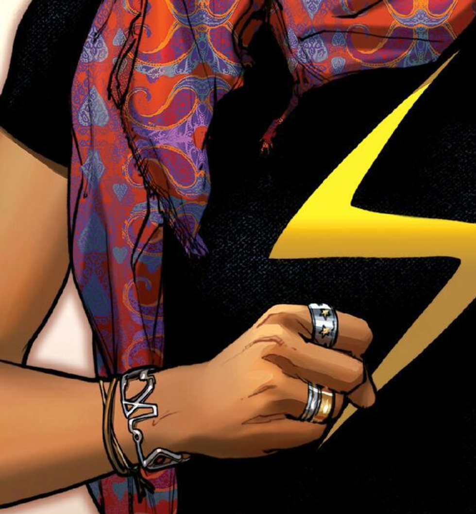 A teenage superhero who struggles with relationships both romantic and platonic, Kamala gets her powers in this first issue when walking home from a party to avoid drinking. She is from Jersey City. She writes fan fiction. She obsesses over the Avengers.