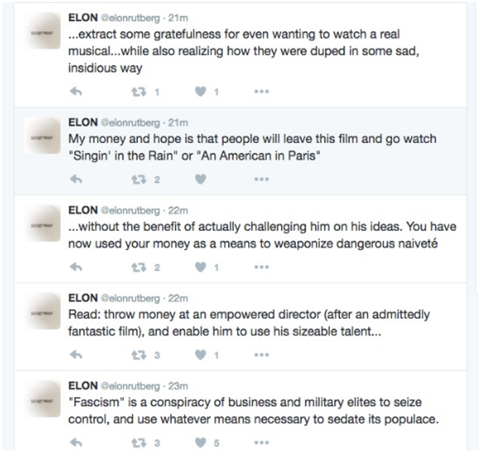 In his series of tweets Rutberg elaborates by condemning the film for being an inaccurate representation of the realities and struggles of success in Hollywood. He defines Fascism as, "a conspiracy of business and military elites to seize control, and use whatever means necessary to sedate its populace," and comments on how when an inordinate amount of money is put into a film, is guaranteed to be a success, audiences will relate to the message of the film and perceive its caricatures as reality, that show business and a career in Hollywood is simple and easy to achieve. This is the "dangerous naivete" that Rutberg speaks about.