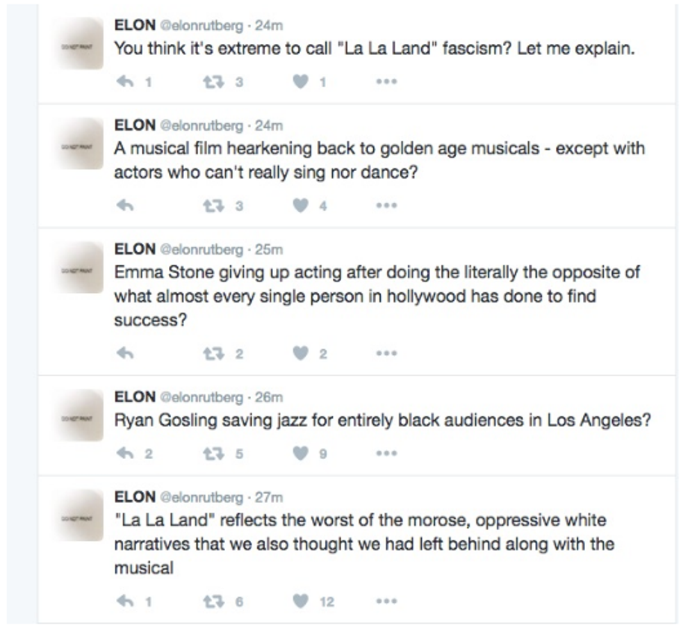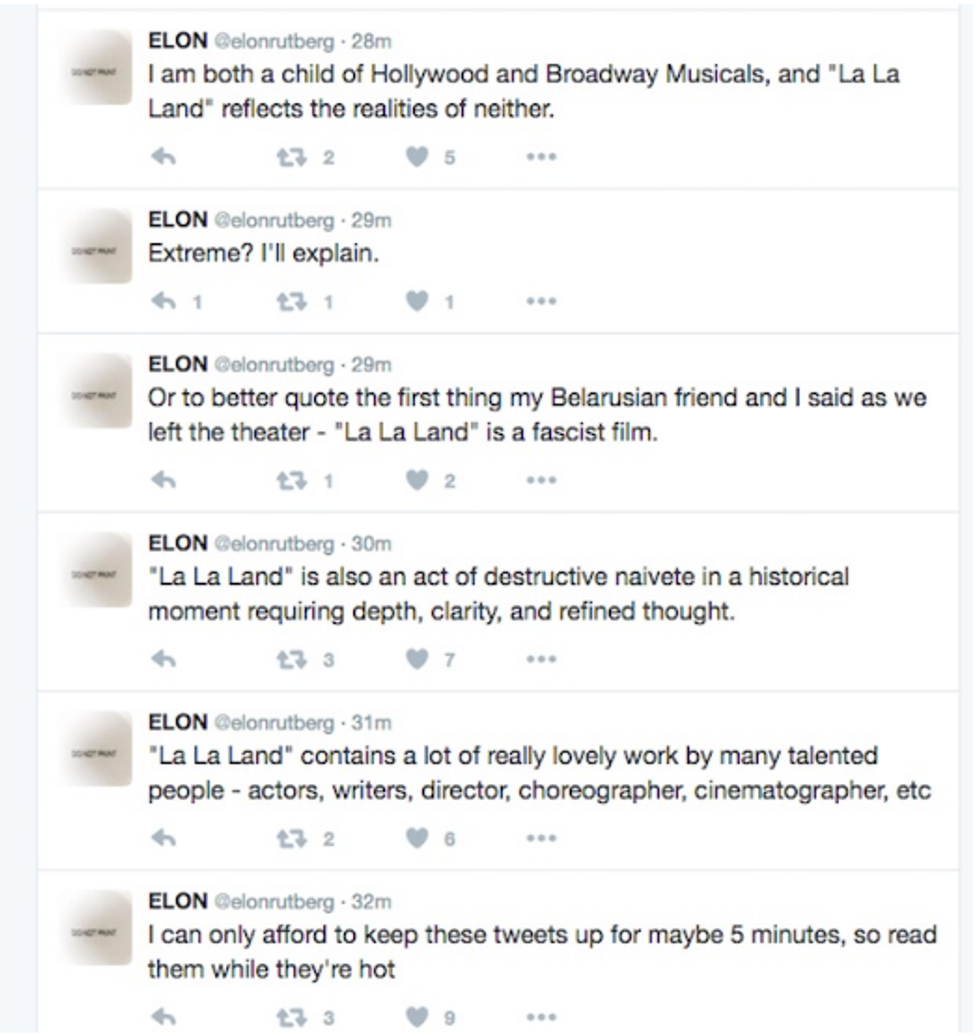 La La Land is written and directed by Damien Chazelle. He also wrote and directed the Oscar-winning film Whiplash. In his tweets Rutberg criticizes the film's main characters (played by Ryan Gosling and Emma Stone) for not acting in correspondence with what he believes is the reality of a career in Hollywood.