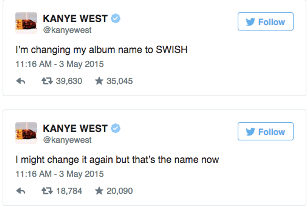 On May 3, West took to twitter again, changing the upcoming album title to “SWISH.” He also hints at changing it again, just to keep us interested.