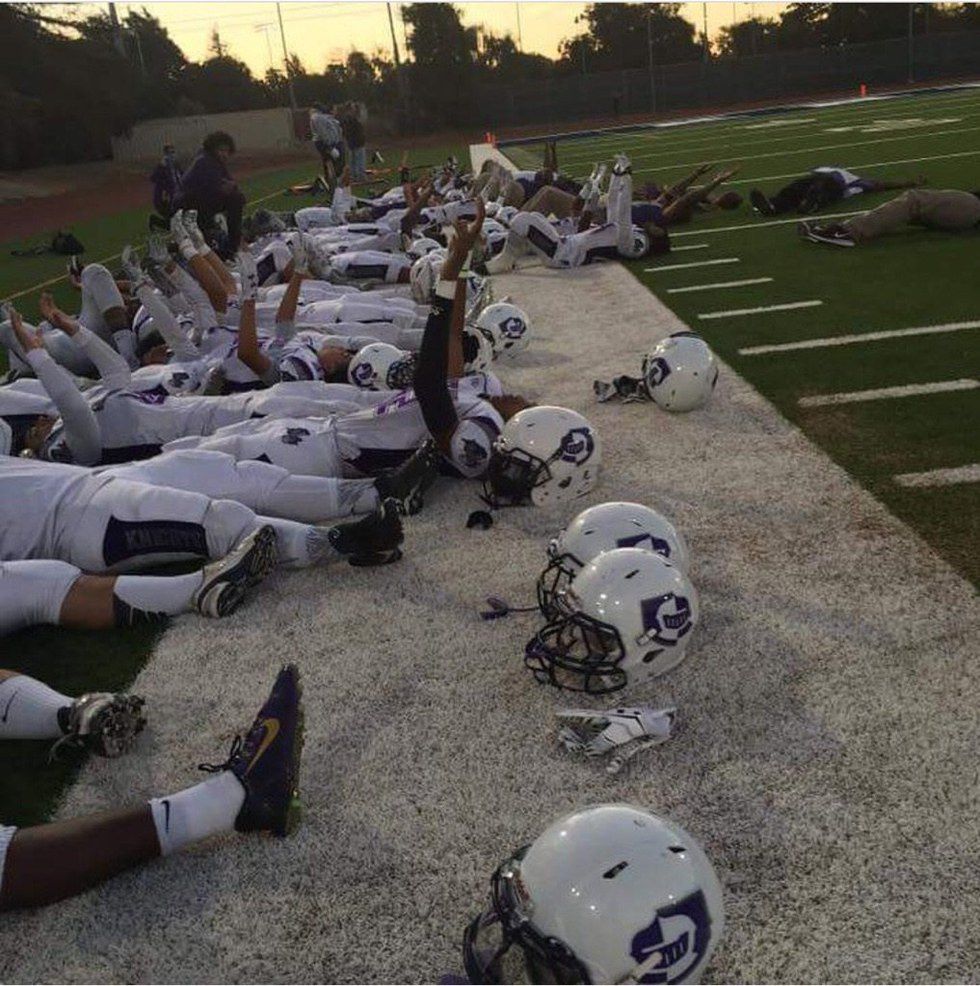 The Castlemont High School football team of Oakland, CA first caught Kaepernick's attention last week when the entire team and coaching staff took a knee and raised a fist into the air during the national anthem. Kaepernick then paid the team a visit before their game this week to commend and encourage them in their efforts. Following that speech, the team took their protest a step further, this time by laying on the ground with their hands in the air, while Kaepernick kneeled on the sideline.