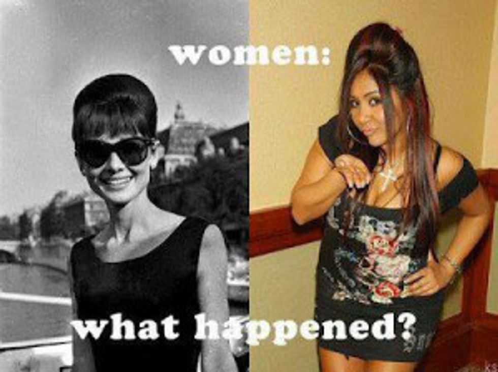 Now, this is not a feminist rant, but the extreme sexualization and lack of respect towards women shows a blatant absence of class. Back in the '50s and '60s, women were taken on proper dates, didn’t feel the need to flaunt their bodies, and behaved as respectable women. They looked up to women like Audrey Hepburn and Jacqueline Kennedy - women with class. As a woman, it pains me to see all the classless young women in today’s society. Complete, strict modesty is not needed, but a little class and discretion is important. Is it really necessary to leave the house with only 10% of your body covered? The way one presents him or herself is the way in which they will be perceived by the outside world. If you wish to be respected and taken seriously, walking around half naked and lacking class is not the way to do so.