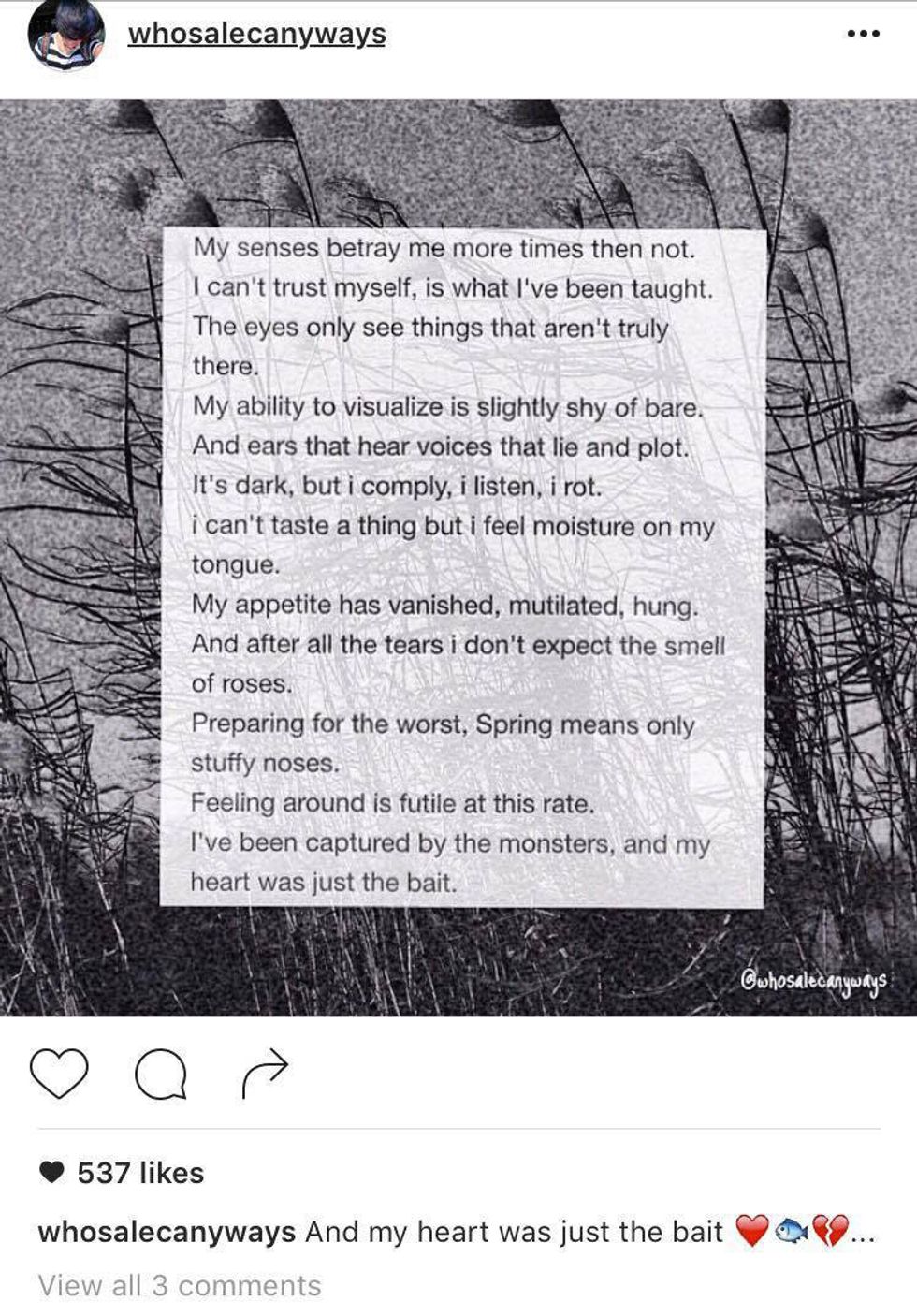 Another thing I would like to quickly address is the idea of traditional "attractiveness" or "favorable" forms of artistic masterpieces. I put my heart into the process of writing in making poetry or original quotes, I spend time and effort into editing photos for the visual I want to portray, and I have strategic tactics for posting and engaging with the communities I most commonly interact with on the internet. I'm not just some Romeo who wants to talk about his problems and get some attention for it. This is a process, and I love every second of it. It is a hobby and a passion, and although I loved hearing I can be inspirational or uplifting to some, the purpose of these posts are for myself.