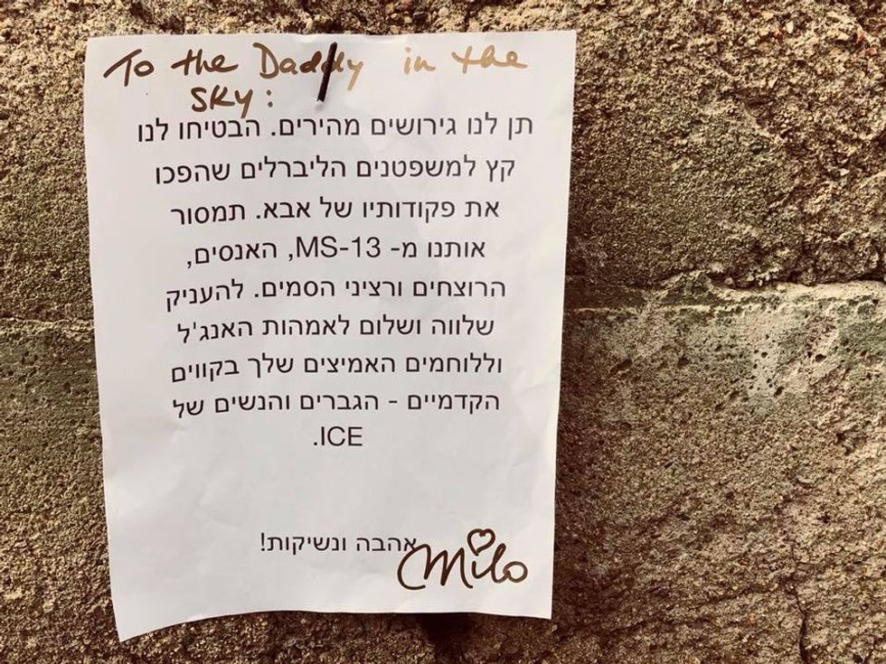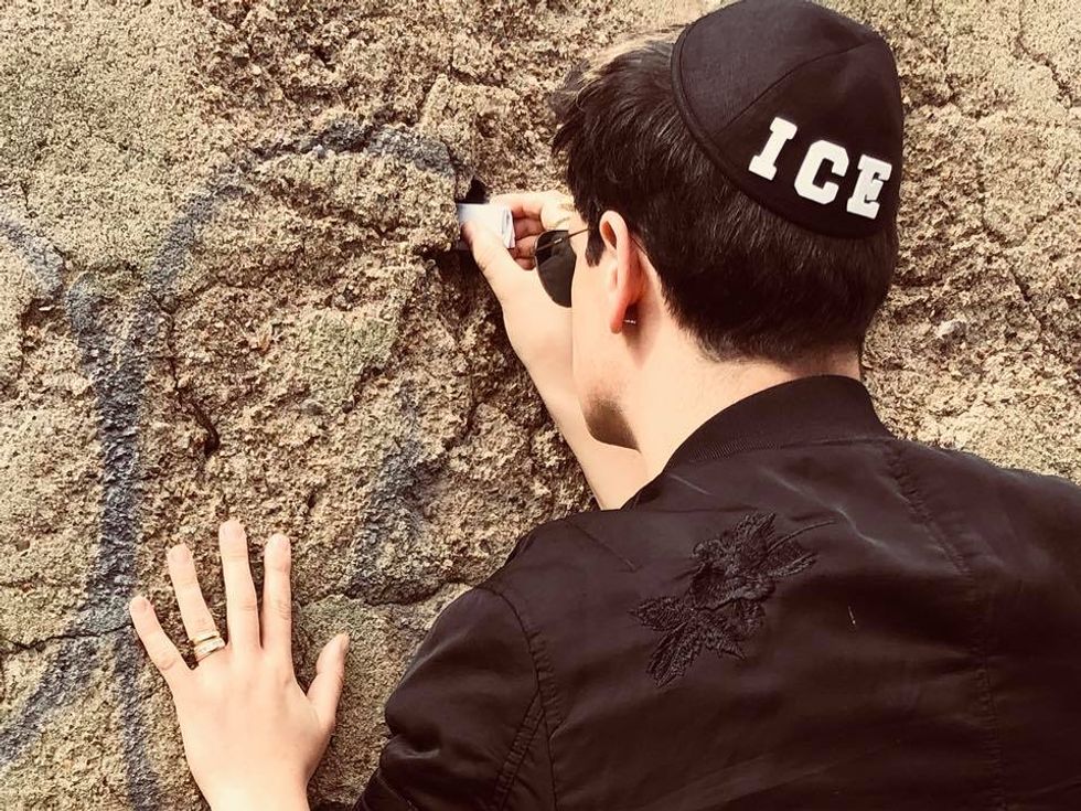 Yesterday, Milo Yiannopoulos made a post on Facebook in which he attached three photos of himself wearing a yarmulke with the letters ICE glued onto it (showing his support for the U.S. Immigration and Customs Enforcement ) as he prayed to a random wall (that somewhat represented the Western Wall/Kotel where Jews place prayers) where he posted his own “prayer”, in Google-translated Hebrew that stated the following: