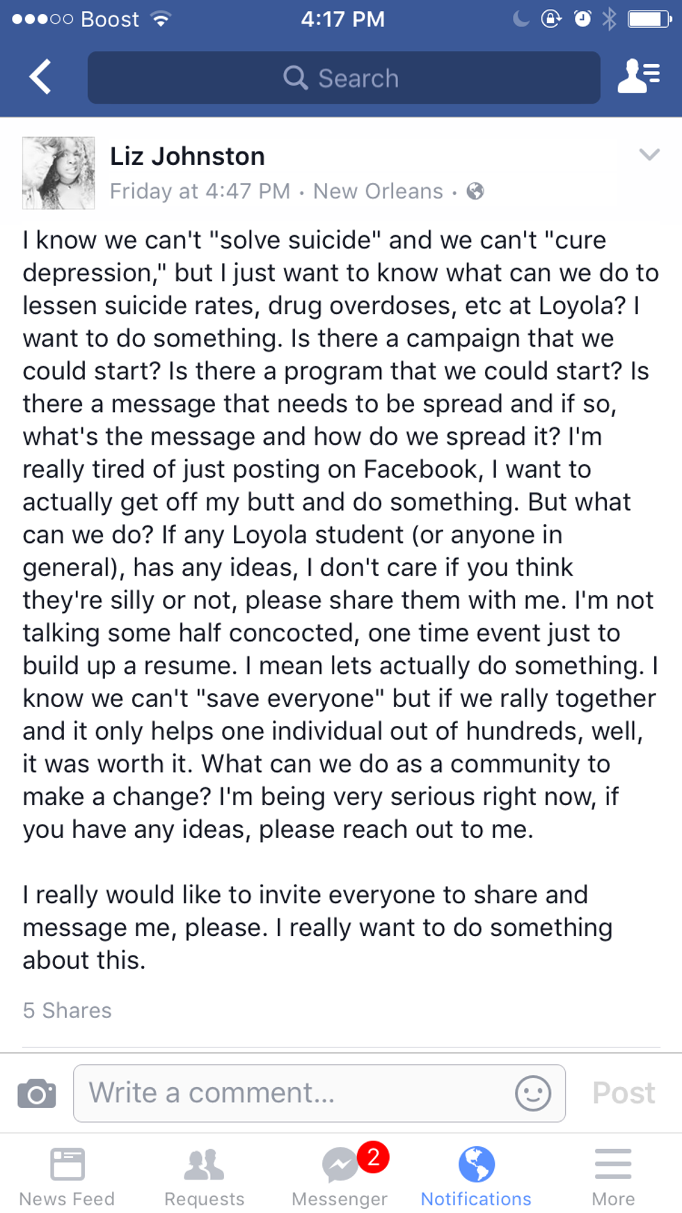 According to a local news article by WDSU, four Loyola students have died since January 2016. Two of which died on campus. That's almost one person per month. I know that some people might say, "Well, that's not a lot. College students die all the time! It just happens." But at a campus that's only a few blocks wide with less than 5,000 students total, four is a considerable amount of deaths. Another crucially important aspect is to remember that these students were not just numbers or statistics. They were members of our communities and, most importantly, they were human beings.