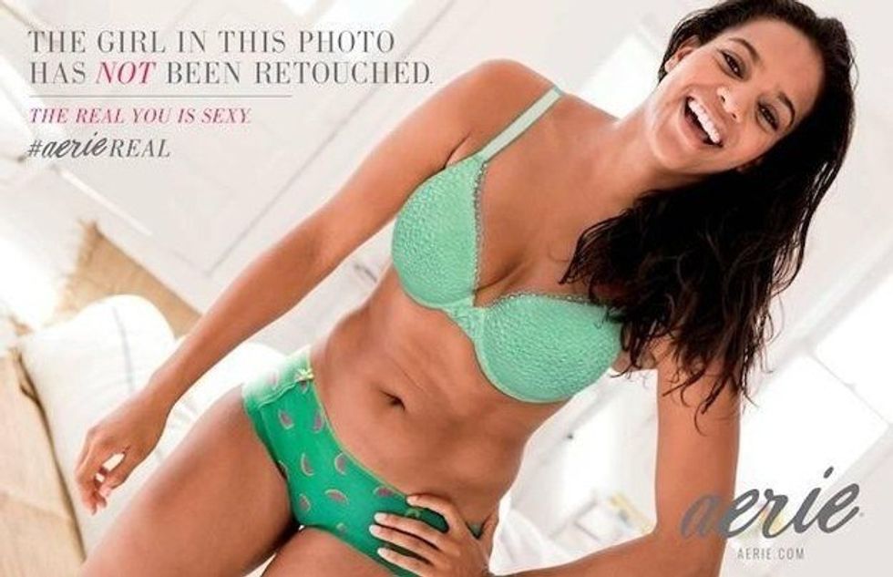 With its #aerieREAL campaign, the company promises not to re-touch any photos of its models--something Victoria's Secret has come under fire for numerous times after continuously posting botched re-touched photos onto its website.