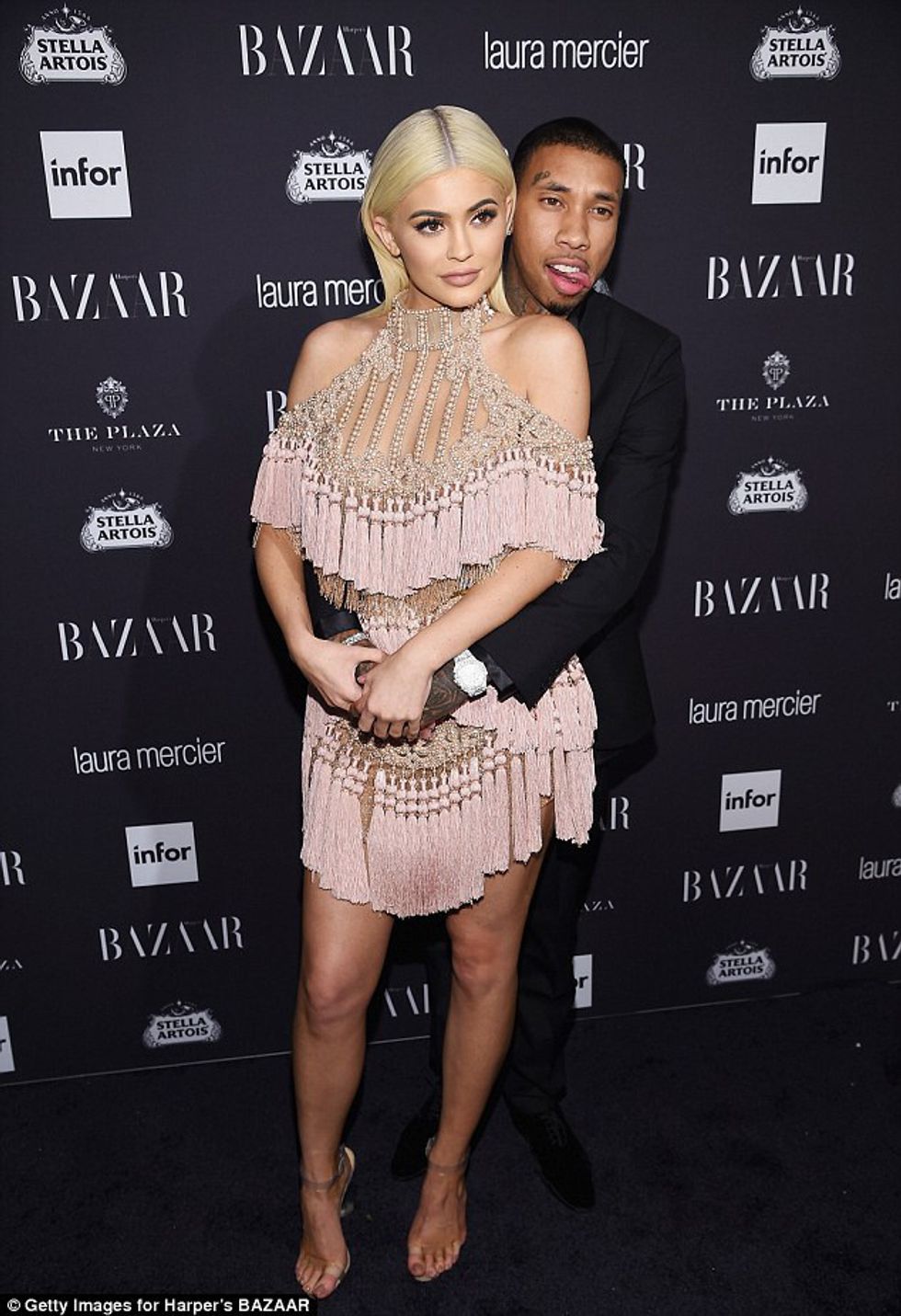 Diverging slightly from the ruffles trend we’ve been seeing on the runway, Kylie arrived at the Harper’s Bazaar Icon party sporting a pink tasseled dress from her ever-growing Balmain collection. She paired the look with clear heels and her always-fashionable BF, Tyga.