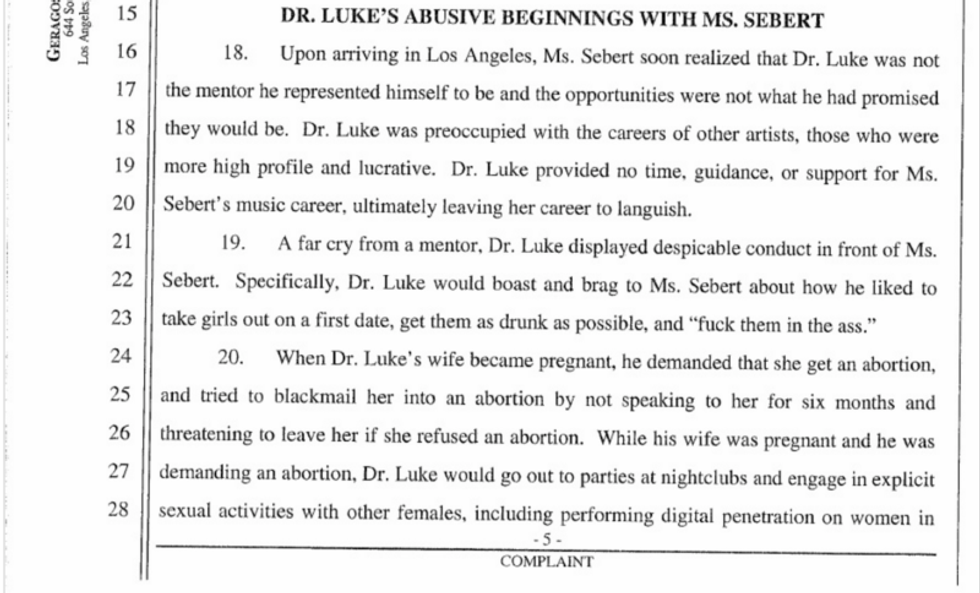 According to the court documents, Dr. Luke was more preoccupied with current big artists and gave no time to mentor Kesha as he had said he would. Instead, he had time to tell her about all of the women he would take out on first dates, get them hammered so he could engage in anal sex with them. Kesha also witnessed his attempt to blackmail his wife into having an abortion, while he went out to clubs and publicly performed digital penetration on women. So Kesha was stuck in L.A. with neither the guidance nor support that she was promised but received continued intimidation by Dr. Luke from his crude sexual stories of how he treated other women.