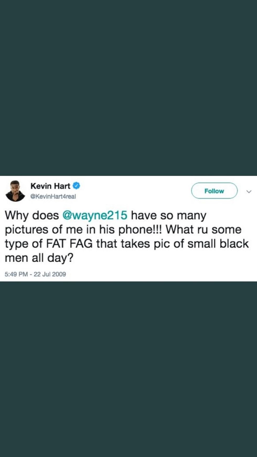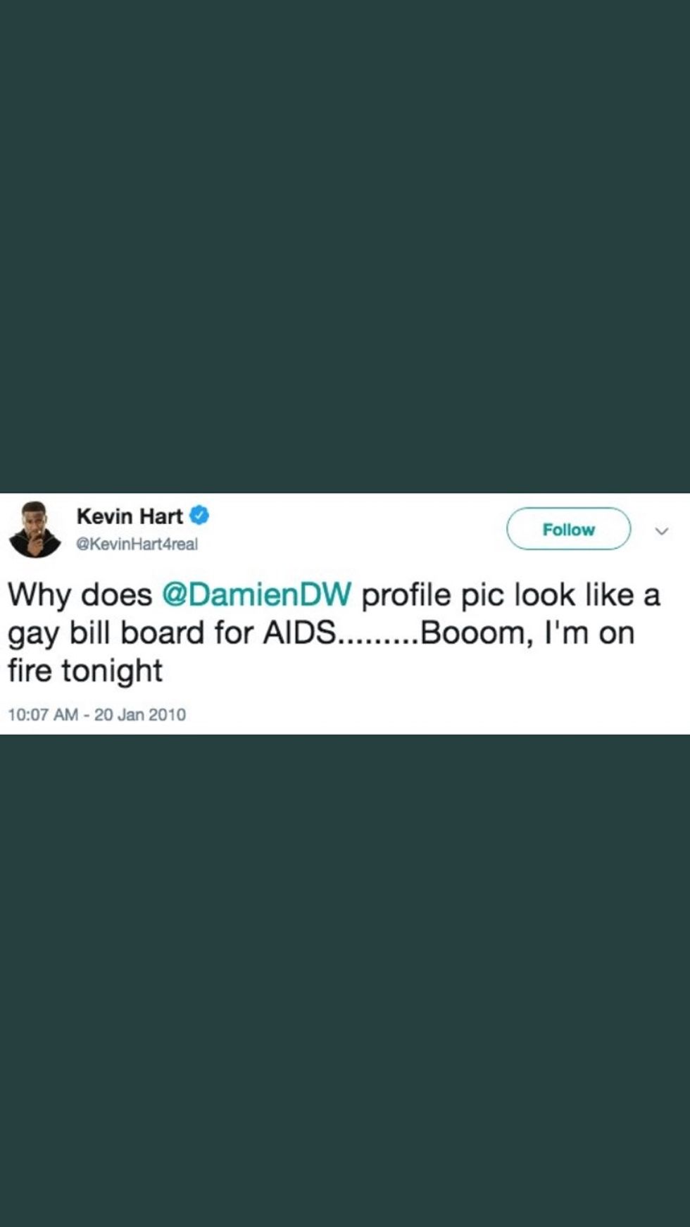 To start with it's important to know what Kevin Hart said in these tweets. A twitter user @adamvbary did a search of all of Hart's tweets with the word "gay", "fag", or "homo" in them and made a GIF out of it. Here are some of the worst things Hart said...