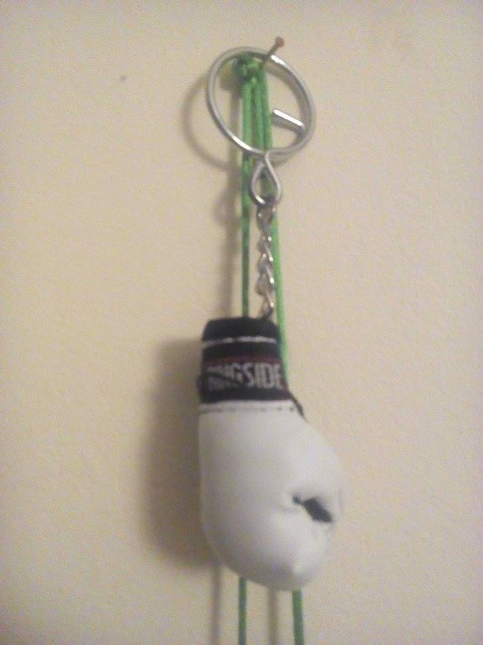 On my wall hangs a boxing glove keyring (a very realistic one, seen below) that I earned in Fresno during my dedicated years of martial arts training. After attending every single class of Kickboxing over the course of the semester, without missing one, my teacher singled me and two other classmates out for our valiant effort towards our training, making me feel like a massive nerd in front of the whole class while they clapped. He handed me the keyring and we bowed, saying “Osu!”