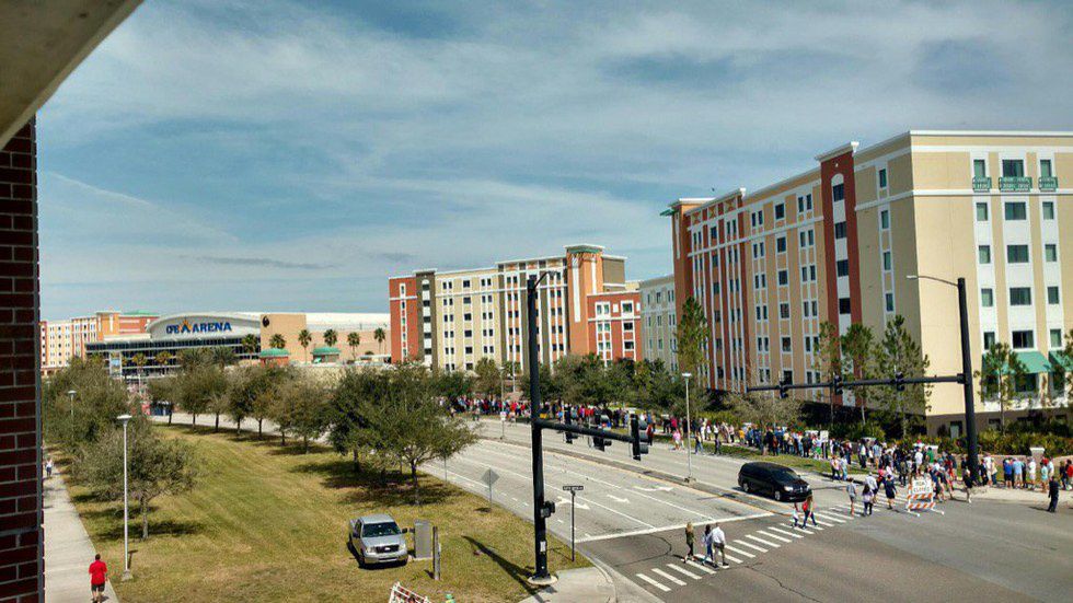 I picked out a Planned Parenthood t-shirt and grabbed some College Democrats sunglasses -- just enough liberal paraphernalia to be noticeable, but not obvious. By nine thirty, I was ready. The moment I left my building, the noise hit me. The music was deafening, and the crowds were already loud. I passed through a gaggle of supporters-the line extended out from the CFE Arena across a road and around a corner, the end out of sight.