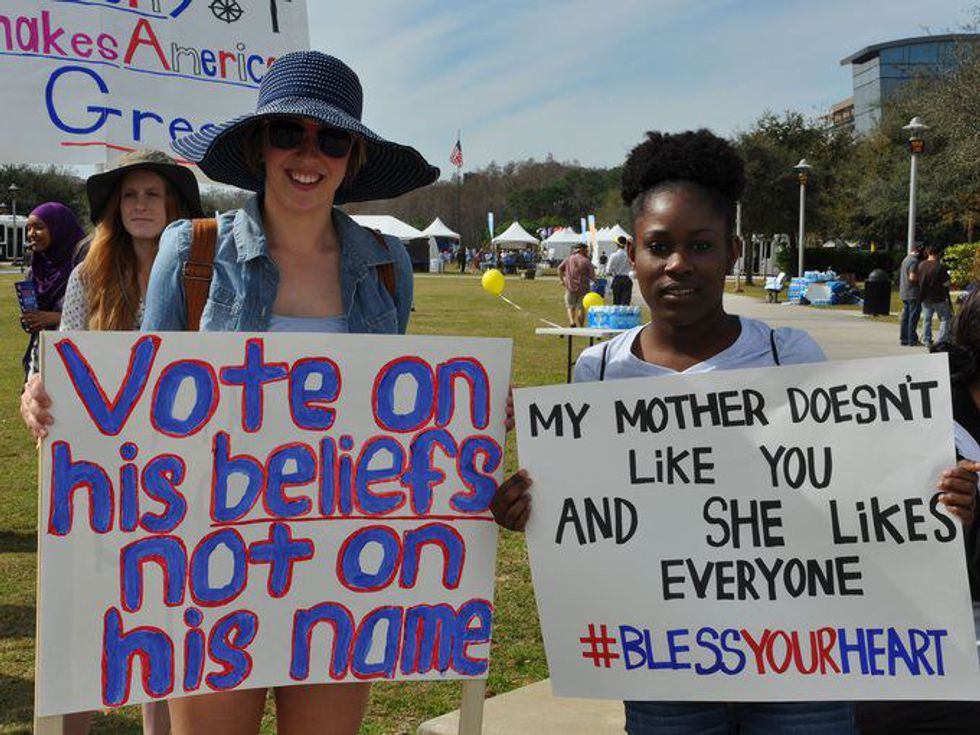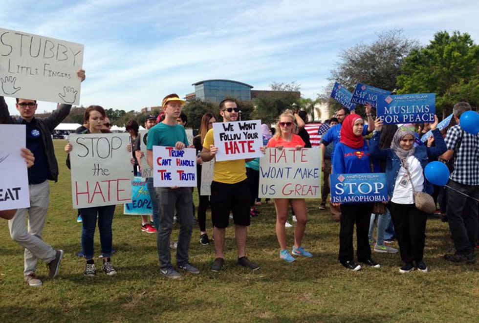 On the grass across from the Arena, I found two groups of early-rising protesters. Next to a giant sign, there was a group of men, women, and children representing American Islam, an organization dedicated to the principle that “Islam is Peace.” At a table not far from this group, I joined my friend Joey, who had volunteered to help organize the protest. He and the other organizers wore yellow foam visors marked “UCF Philosophy Department” in order to help distinguish themselves in the crowds that would form later that day. Throughout the event the organizers were helpful and friendly, facilitating poster-making, organizing people and supplies, and interacting with UCF Police Department officers to make sure everyone stayed safe.