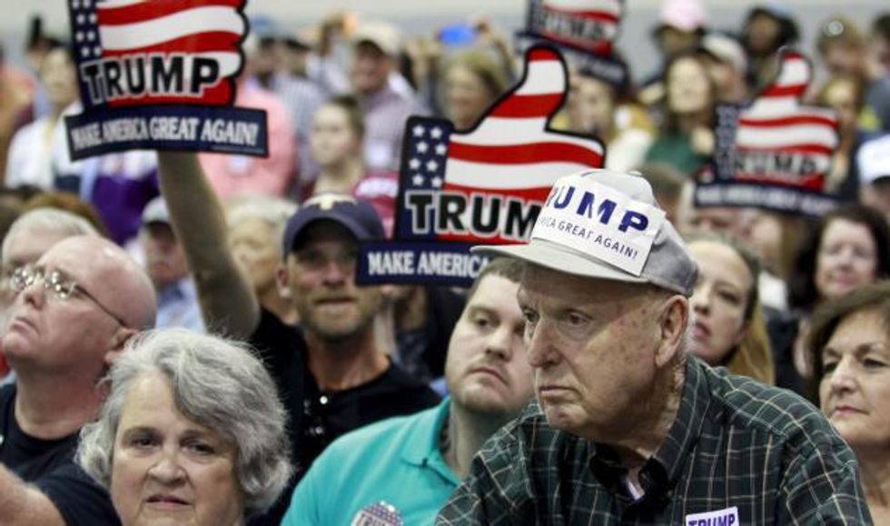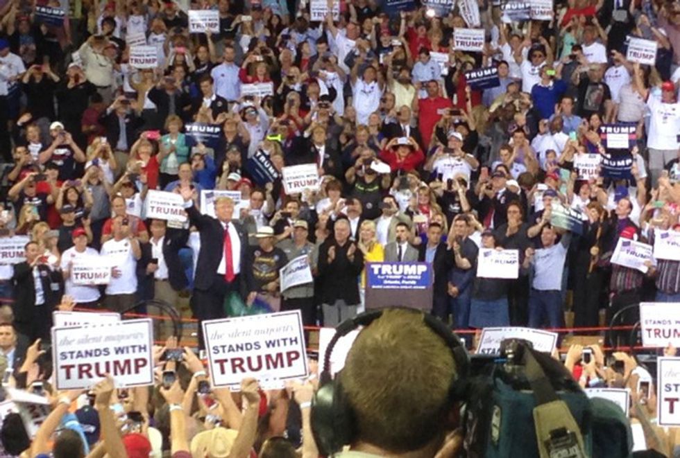 Trump is an hour late to his own rally. The same few songs play on repeat, vaguely familiar oldies no doubt meant to appeal to Trump’s middle-aged, baby-boomer fans. But those are far from the only demographic represented in the crowd -- teens, young adults, families with small children, as well as the expected older folks, stood and chanted, decked in full Trump regalia. Finally, the music changed to a majestic-sounding instrumental track, with the bass cranked up so high I could feel it in my chest, The Donald came out. The cheers drowned out the music. He began his speech by touting his love for Florida, specifically a golf tournament in Miami that takes place on a course that he owns. I slowly space out as he goes on to explain how he’s going to “Make America Great Again.” It's walls, and bigotry, and ignorance repeated over and over again.
