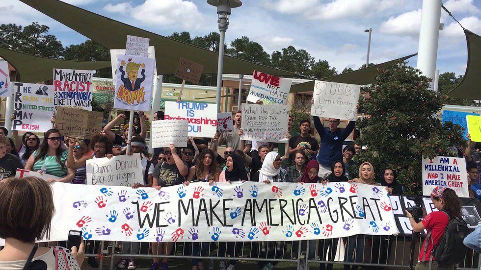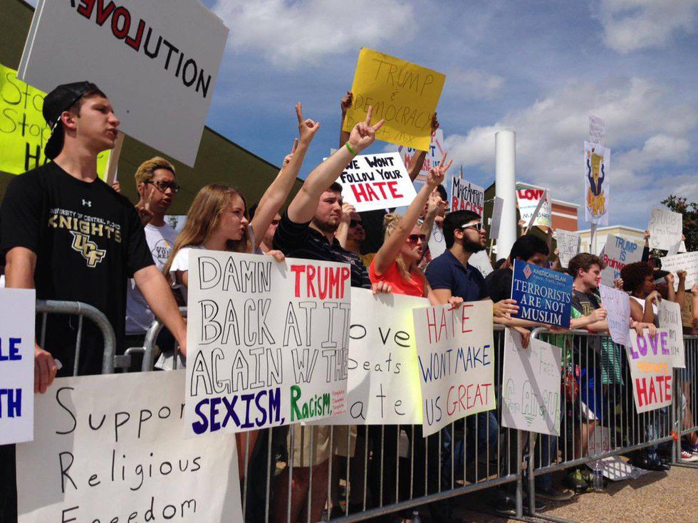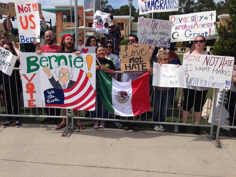 A group of protesters who have been kicked out gather next to the back exit, and we swap stories. A woman asks us for our names and takes some notes on what we say. When we return, around four o’clock, the protest outside is going strong. Many more people had arrived while Joey and I were inside, lined up all along the road and en masse behind the barrier. The mood out here provides a stark contrast to the one inside. Despite Trump’s speech booming from two giant speakers, and the supporters who have gathered to listen to it, the mood among the protesters is light, almost celebratory. I see many of my friends, one of whom had driven up from Tampa to be a part of the protest. A drag queen dressed as “Donna T. Rump” walks around, making protesters laugh with her impressions of the odious orange man. We keep chanting the same few slogans as the rally comes to a close.