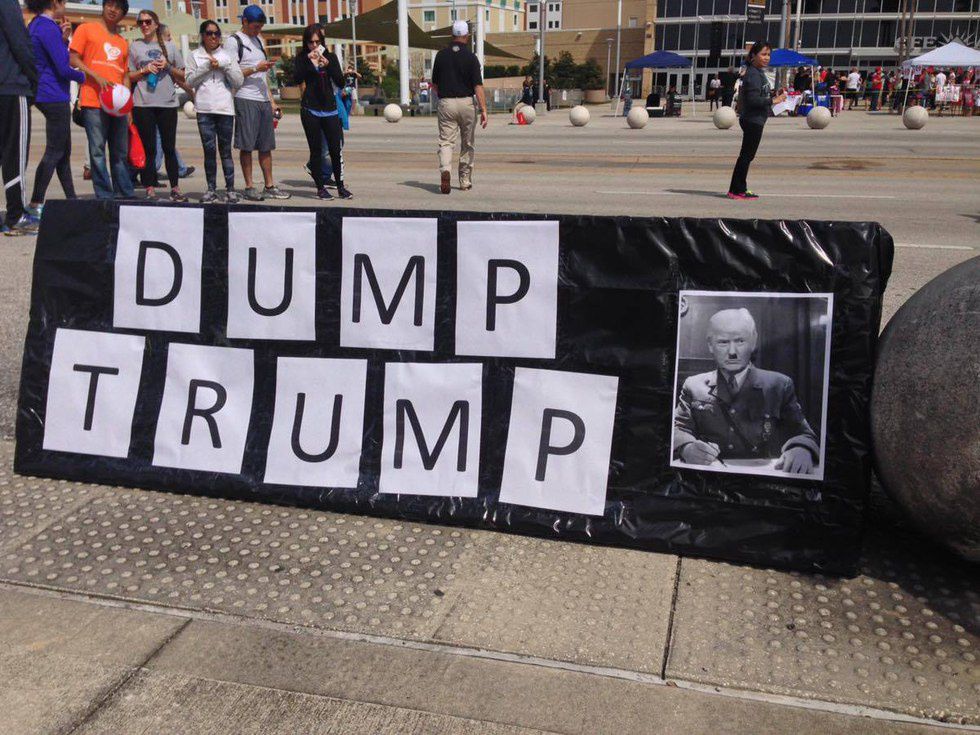 I took a Starbucks break to grab a sandwich and pick up some friends. Between the protest and the café, a walk against juvenile diabetes was taking place on the lawn. It was surreal to see families laughing, volunteers dressed up as Disney characters cheering them on as they passed the finish line, within sight of the Trump rally and the protest. Returning to the protest fed and ready to go, I found a somewhat larger group than the one I had left. It must have been around ten or ten-thirty in the morning. We started chanting, “We make America great,” “No more hate,” and “1, 2, 3, 4, show Donald Trump the door!” Sharply-dressed news reporters stood out from the crowd, smiling at the cameras and interviewing a few protesters.