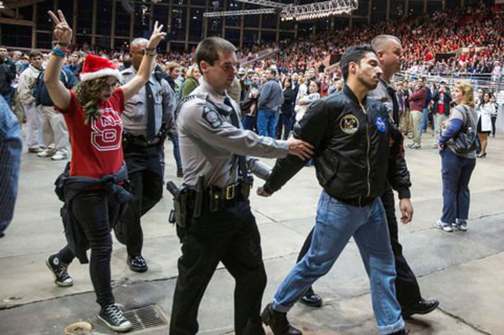 In the midst of this insanity, other protesters provide some small hope. Two young men on a balcony yell unintelligibly and tear up signs -- they are forcibly grabbed by police officers and removed. A group of people standing on the floor by the stage -- I shudder to think of how early they must have lined up to get those spots -- reveal hidden posters with slogans I am too far away to read. A man in the stands gets up to speak his piece. He is booed by the entire arena, and taken out still screaming. Trump addresses us, the protesters, calling Bernie Sanders weak for letting Black Lives Matters activists take over his podium to call attention to racism in this country. Trump praises the police, thanking them for being “strong,” for removing the protesters from his rally. The crowd cheers.