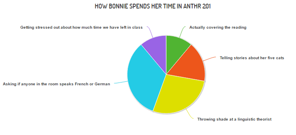 This past Wednesday, my linguistics professor was taking a moment to jot down the lesson plan for the day on the whiteboard before class started. She sectioned off the lecture topics into seven neat bullet points, and the girl three seats down from me happily mused, “I respond well to lists.” We all laughed in agreement and quickly penned down the clean little list, which is something that our quirky Anthropology professor, Bonnie, rarely blesses us with. Her typical approach to our class, The History of Linguistic Theory, is to feed us lengthy, winding sentences at a rapid-fire pace until she realizes we only have ten minutes left of class, and all she’s covered so far is why Ferdinand de Saussure is a verified nutjob. For a complete breakdown, see figure below: