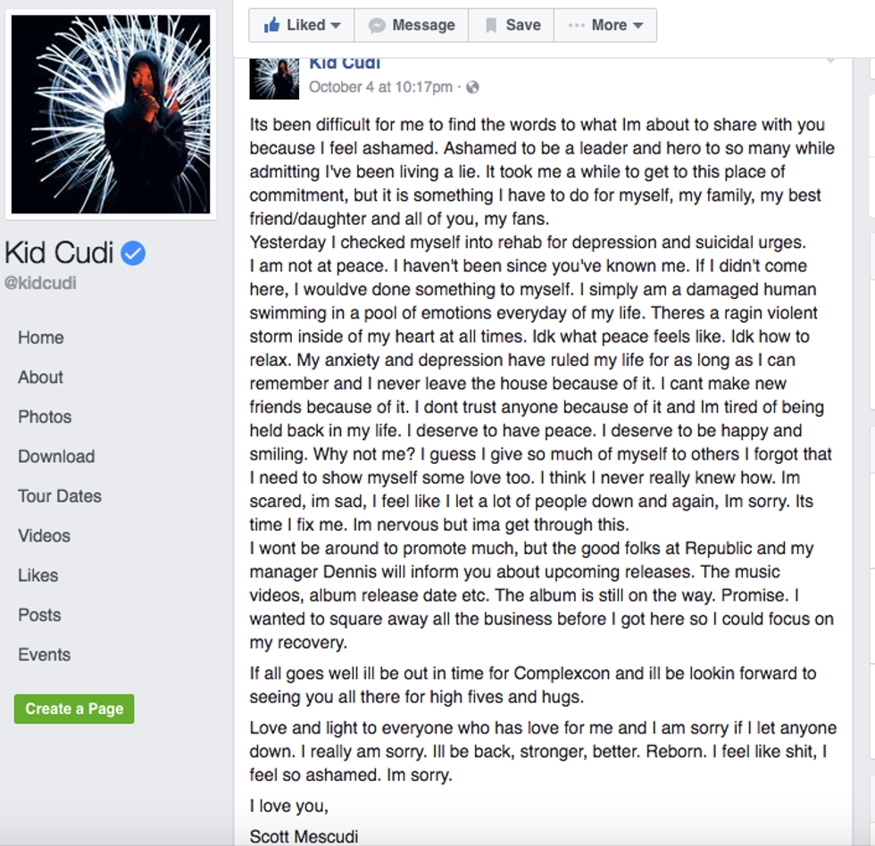 Cudi, we, your fans, hope you get through this, and whether you make any music or not, whether you'll ever be the same or not, whether you ever achieve peace or not, you'll have already made your mark through your previous work, and from your willingness to talk about things most wouldn't even dream of admitting to. That alone is notable, and the impact you've had on others is immeasurable. We can only hope that through rehab and any other steps you take that you can give yourself what you've been able to give so many all these years. To everyone who Cudi gave something, whatever it was, let us help him through this time. As he put it: