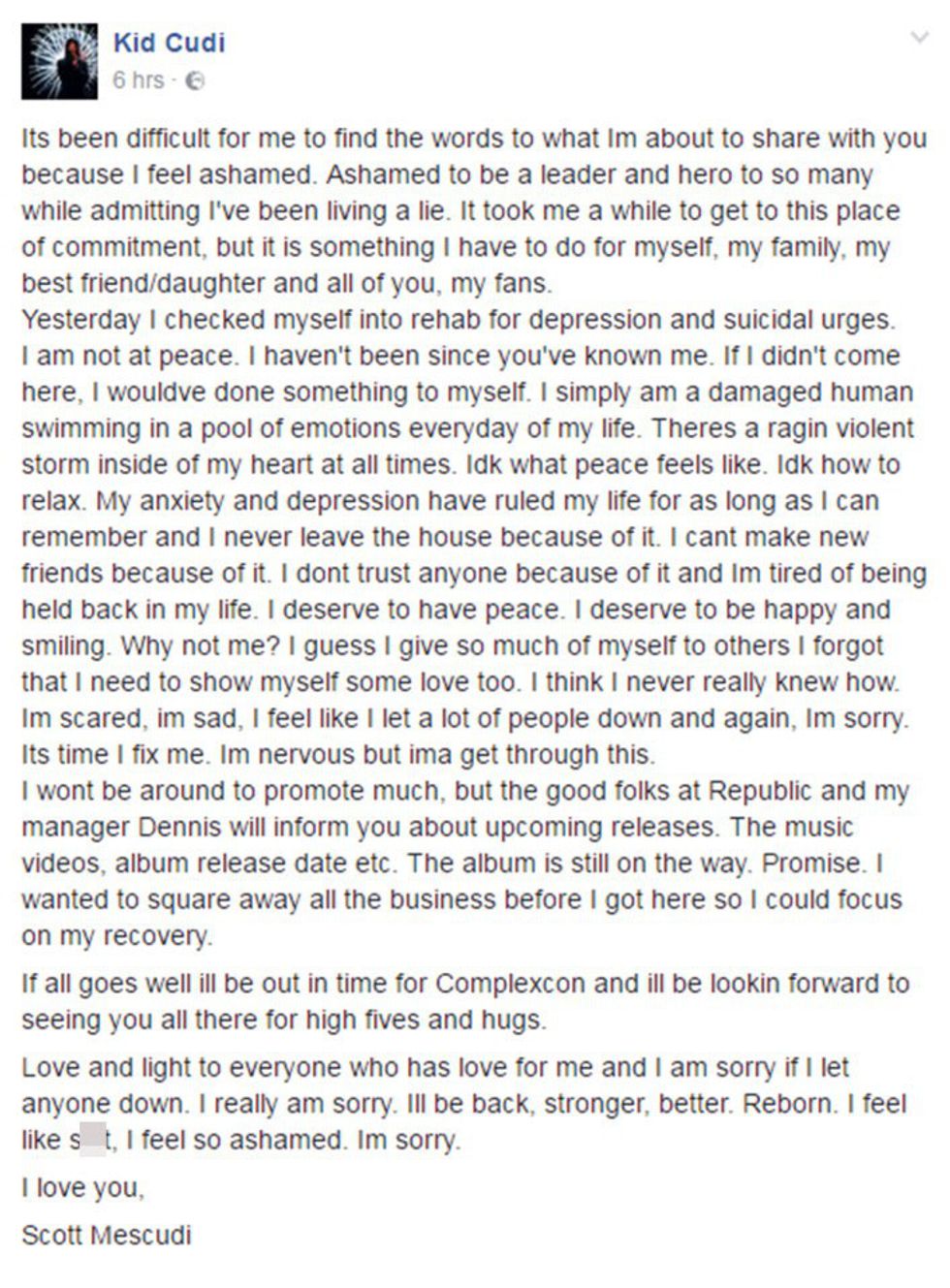 It seems as though society has developed a general assumption of famous singers and songwriters that because they do not need any sort of assistance monetarily or with their popularity, the same goes for their mental health as well. This mentality even expands past celebrities, to those who are not. There seems to be this underlying attitude lingering in today's society that everyone is mentally OK, and depression, anxiety, and suicidal thoughts are not a real things that some people actually struggle with on a daily basis. This is a very toxic thought process to promote, as this is what makes depression and other mental health issues become a taboo to the general public. This was definitely proven by songwriter Kid Cudi and his announcement for taking a break from releasing music to receive professional help for his ongoing depression and thoughts of suicide.