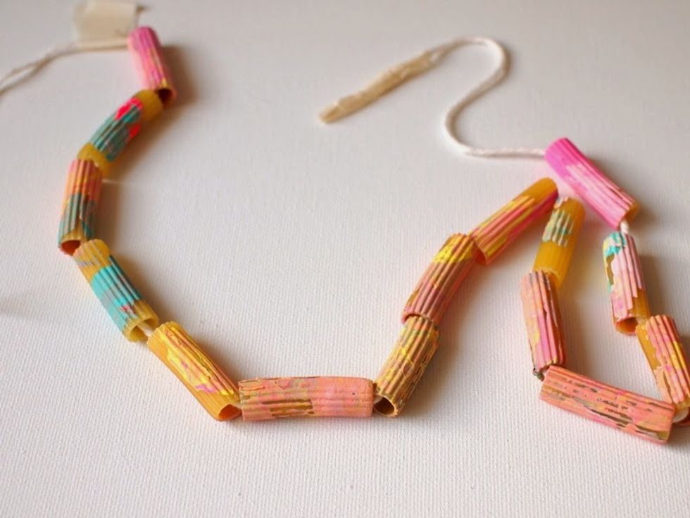 These necklaces can be made with any pasta that has a hole in the middle. The kids can also use their imaginations more and paint and decorate the pasta.