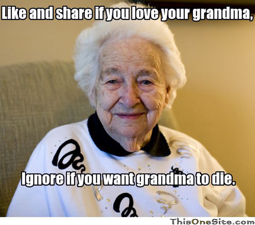 Getting back on track here, why do these types of memes and pictures plague social media. As if Mark Zuckerberg, the founder of Facebook, is sitting on his porch with a death ray monitoring my every mouse click. We see these pictures and think "Oh no! I love (Mom, Grandma, The Pope, Jesus, Vishnu, Darth Vader, Sally from next door, etc). I don't want them to die. Yet, we know that the probability of them keeling over in their flower bed five seconds later would be next to impossible. Even if that did happen, the horrific irony would be highly intriguing.