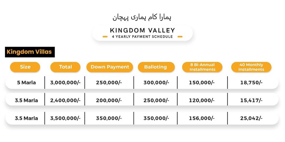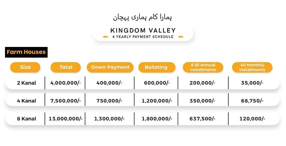 Following are the payment plan for Kingdom Valley Farm Houses:
