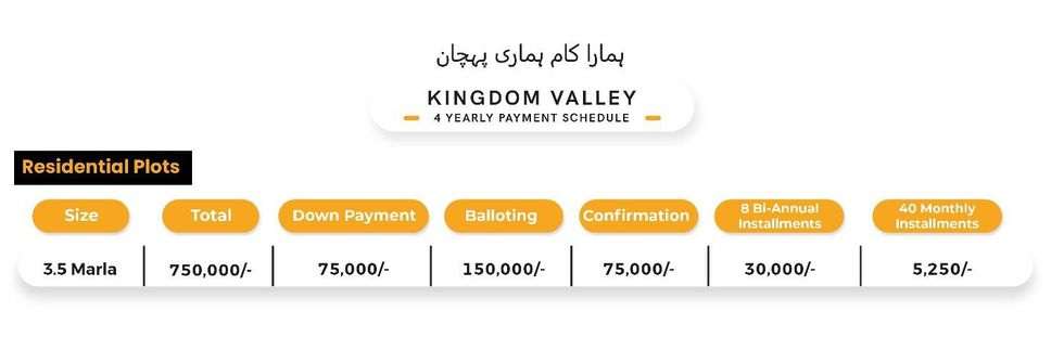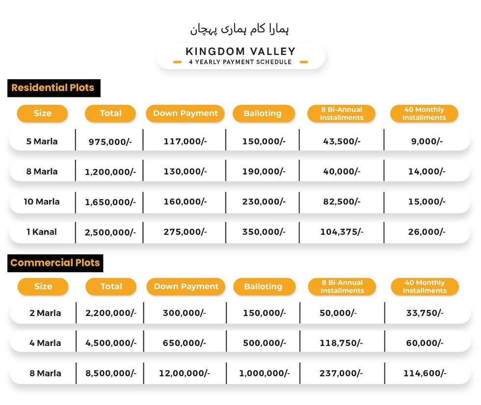 Payment plan for Commercial/ Residential Plots: Following are the payment plan for Commercial/ Residential Plots of Kingdom Valley