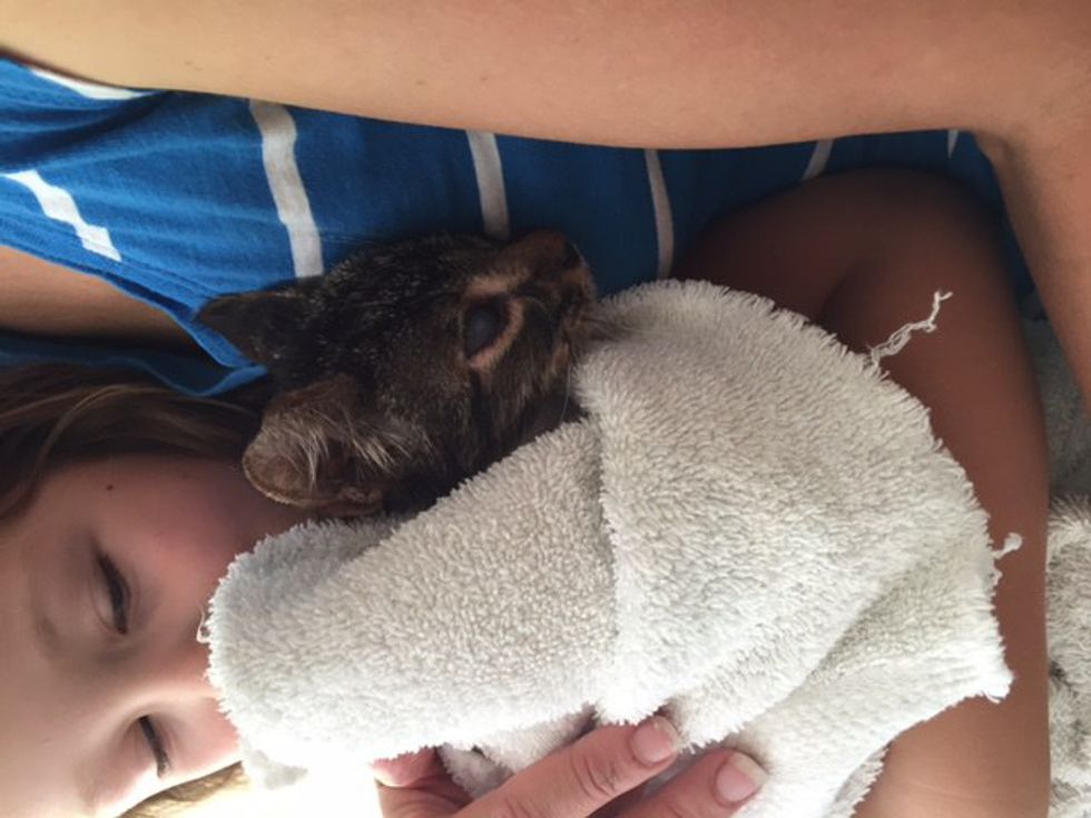 Everything started with a Facebook post about a found kitten. My uncle was on a walk one day when he discovered an eight-to-ten week old kitten, lost and totally blind, mewing for help. He took the kitten to the vet, where it was determined that he had a double eye infection that led to blindness; he also had a number of cuts and missing whiskers, possibly due to an attack while he was alone. The kitten needed three eye drops per eye three times a day and two doses of antibiotics that needed to be given orally with a syringe. My uncle posted a photo of the little creature, wrapped in a towel, and asked if anyone would be willing to take him in. He was bundled up and staring in the general direction of the camera with two wide cloudy gray eyes.