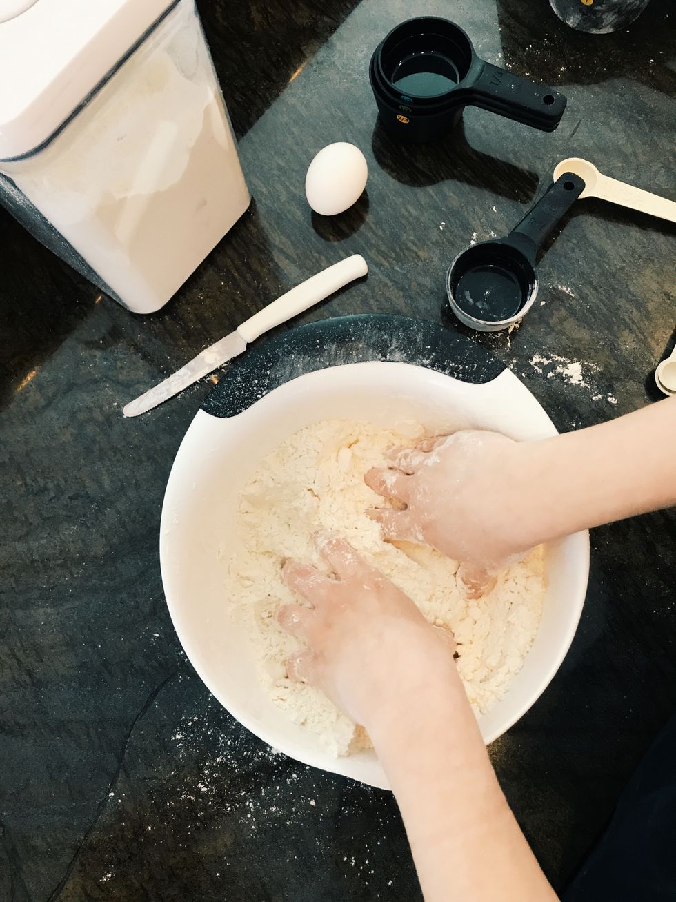 Step 2: Cutting in the cold butter is a tedious task that ensures the satisfying flake of the bread’s crust. Use your hands to combine the butter into the flour for a grainy texture. A touch of chaos is encouraged.