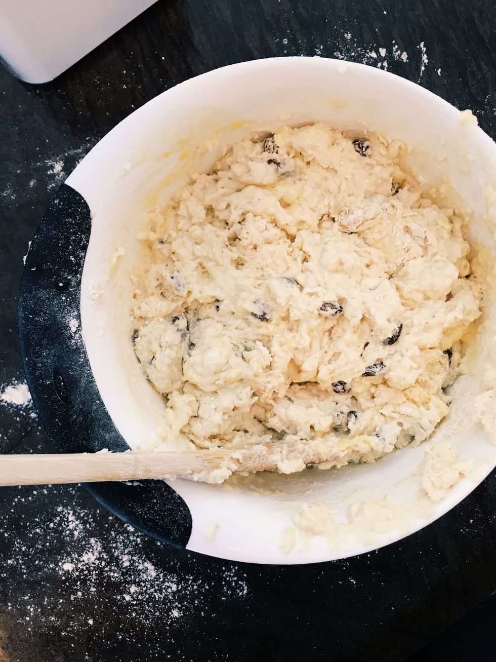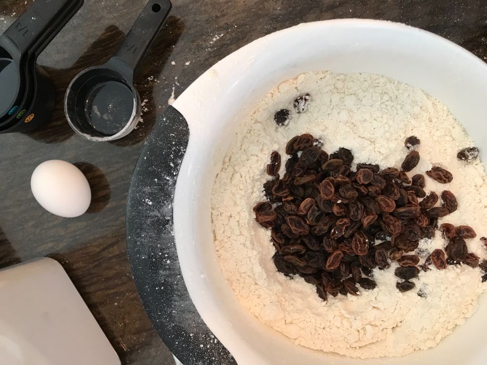 Step 3: Add the previously soaked raisins to the dry mixture. Soaking any type of fruit in water before you bake it into the dough will prevent the fruit from sinking to the bottom of the loaf and ensure an even distribution of said fruit throughout the bake. Mary Berry and Paul Hollywood taught me this one.