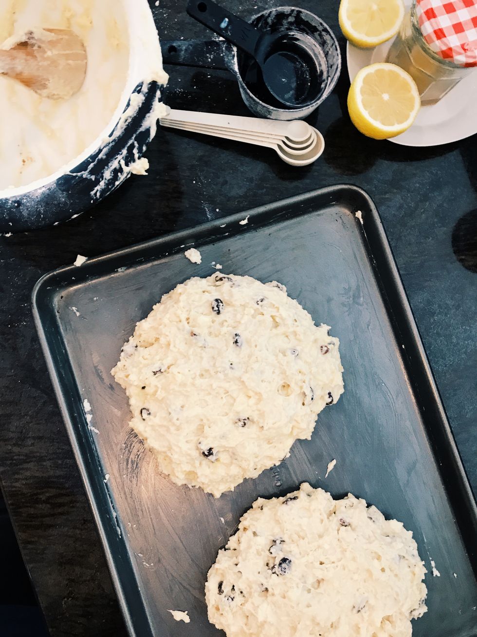 Step 5: Grease a cookie sheet with butter (lots and lots of butter) to ensure that your beloved bread has a free and easy release once it’s finished its work in the oven. Form two circular loaves. If your hands are sticky, you’re doing it right.