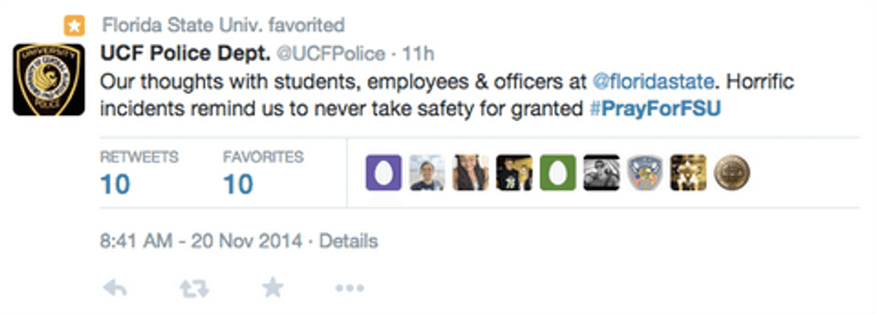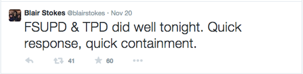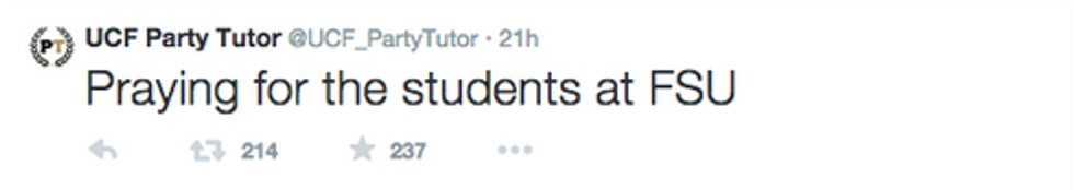 Even re-reading these tweets now sends chills down my spine. I couldn't begin to imagine the amount of horror that Blair went through. And yet, I knew only too well. It was only less than two years ago that at UCF, we too experienced the same fear, confusion and unrest when UCFPD prevented a massacre at Tower 1 on March 17th, 2013. Since then, every fire alarm makes students uneasy. Every time a siren goes off, we cross our fingers and hope it's just another false alarm. But early Thursday morning, that hope was shattered for FSU students when those sirens were followed by the bone-rattling announcement.
