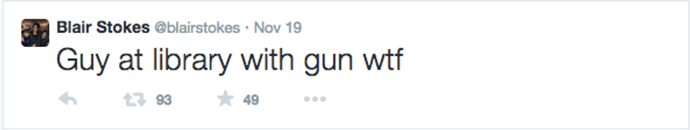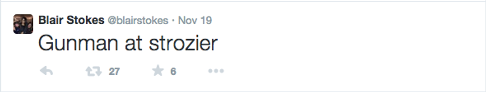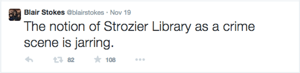 The next morning, that answer became abundantly clear. I spent all of Thursday morning sitting in my living room watching hour after hour of local news reports, reading articles being shared on my Facebook news feed, and reading tweets from Blair Stokes, a girl I've met several times on my visits to Tallahassee, who was in the library at the time of the incident. A gunman had shot 3 students at the Strozier Library at FSU.