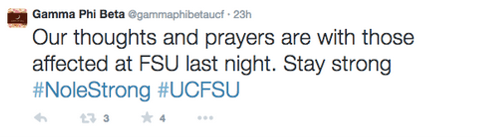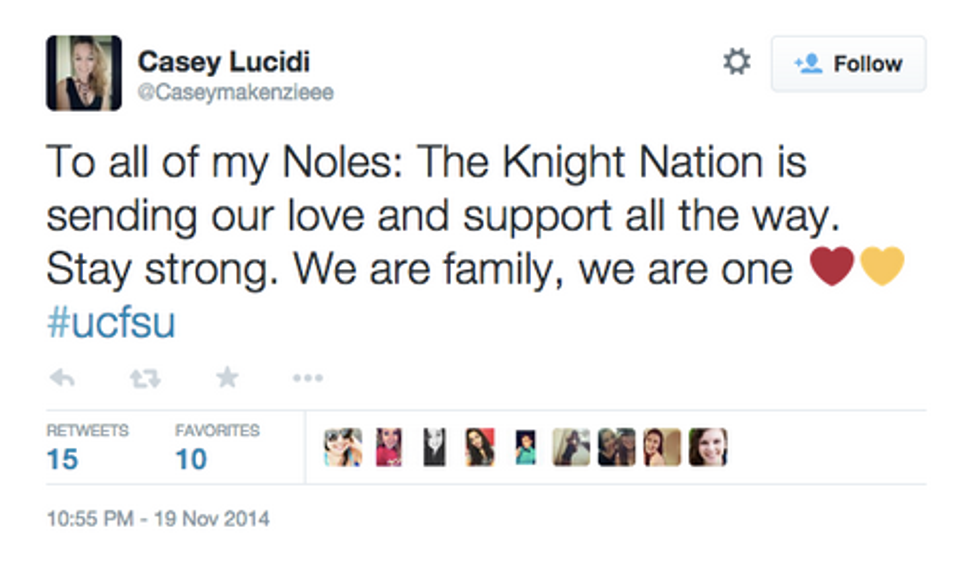 To the students, faculty and staff at Florida State, and all of those affected by this senseless act, the University of Central Florida stands behind you 110 percent. We are #FloridaStrong, we are #UCFSU, and we stand #FSUnited. From a Knight to a Nole, we send to you our thoughts, prayers and love tenfold. Whether we're wearing our Black and Gold, or Garnet and Gold, we are all one community, one state, and one tribe.