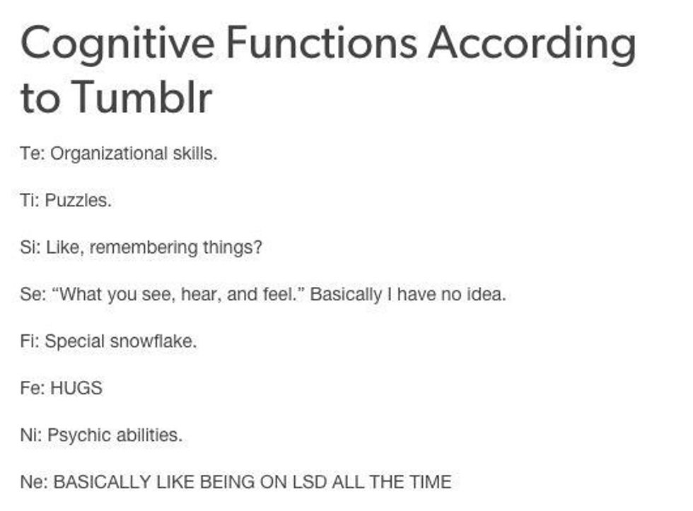 Sometimes you feel psychic. Sometimes your friends even call you psychic. But, a lot of times, your weird "hunches" about life turn out to be right. You just notice the small details more- even if you don't notice that you notice them. Have you ever said something would happen followed with, "I don't know why. It's just a feeling." This goes back to over-analyzing. We can easily find patterns and meanings in the smallest things. All of our function stacks work together here, in a somewhat creepy way.