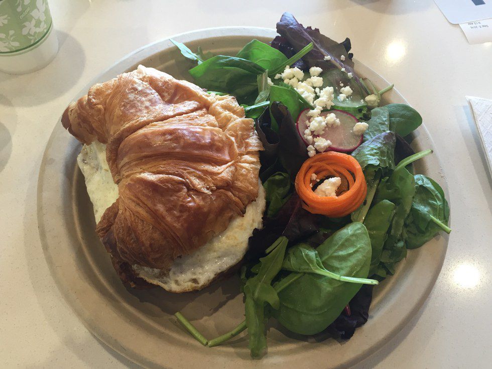 I ordered a corned beef hash croissant - substituted with cooked spinach instead of cheese with a side of salad. Sandwiches come with a side of either salad or potato, but I figured the croissant was enough carbs for the day.
