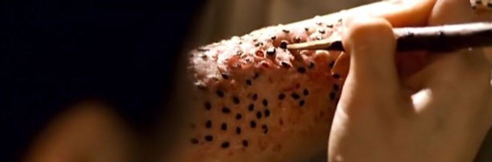 This happens a couple times until the mother, genuinely worried that something was wrong, managed to get into the bathroom only to find the horrific sight of her daughter frantically picking at the sesame seeds deeply embedded in her open pores and repeatedly muttering "wait a minute" to herself.
