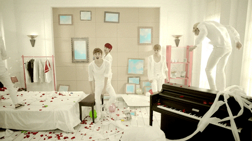 "G.R.8.U" is another song about admiration. Something I find really interesting about this song is that the music video is played in reverse. It starts off with the house a mess, but the further you go into the music, it's as if they are cleaning up the mess they made instead of being in the process of making it. The beginning of the video shows their previous music video, "Hyde," on the TV-screen. Just from the preview you can tell that it was a dark concept however, "G.R.8.U" is a much softer and happier song and music video. This is one of the videos that should have the "don't try it at home" warning. I hope you enjoy the video and that it adds joy to your life, but please don't destroy your home. The mess won't be as easy to clean up as it looks in the music video!