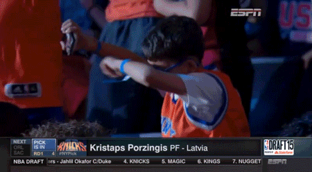 The name that followed was Kristaps Porzingis. Not Emmanuel Mudiay. Not Justise Winslow. The unknown Latvian player Porzingis. Safe to say I reacted pretty similar to this kid.