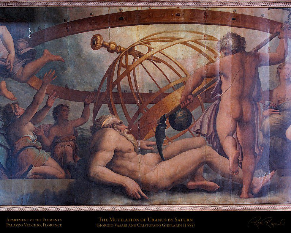 After Ouranus fell asleep one day, Kronos told his four brothers to hold onto each of Ouranus's limbs and to pull as far away from each other as possible, and each brother ran to the four corners of the earth, forming the directions of North, South, East and West. Kronos taunted his father and told him that he is going to rule the universe in place of him. Ouranus struggled for freedom, but Kronos raised the scythe and cut off his father's manhood, leading to the first castration, and causing him to bleed out to death.