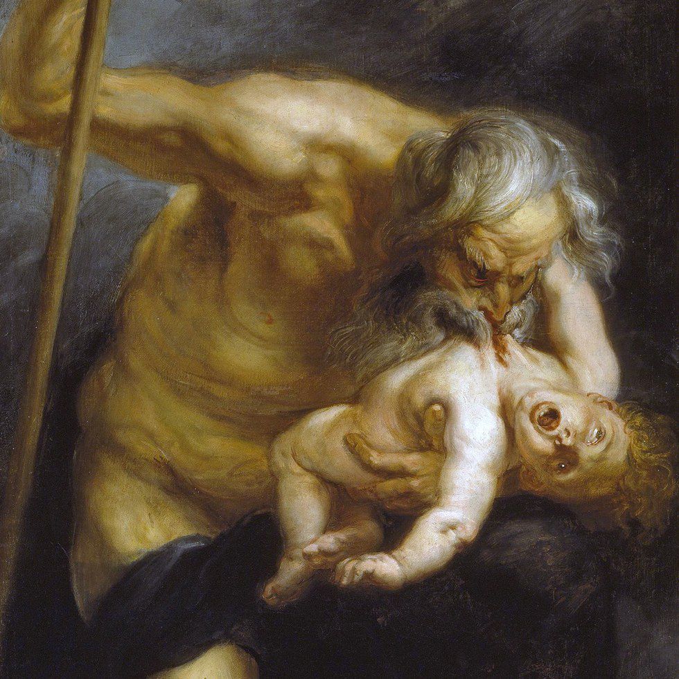 Furious for his child's future betrayal, he took his first child, a girl with brown eyes and cute brown hair, and swallowed her whole, thinking that any child in him will never escape. He waited for Rhea to gave birth and ate each child as they came out. After Rhea gave birth to their sixth and final child, he rested with a full stomach.